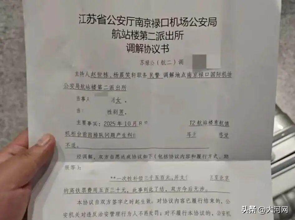据新京报, 机场公安介入后,涉事双方在民警主持下达成调解协议:打人方需向受害乘客公开道歉,并一次性赔偿3500元,另支付其改乘高铁至北京的530元费用(总计4030元)。协议明确双方纠纷“到此了结”,若打人方未履行,公安机关将依法给予治安处罚。